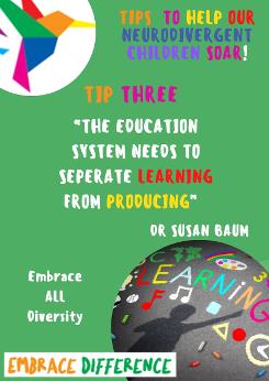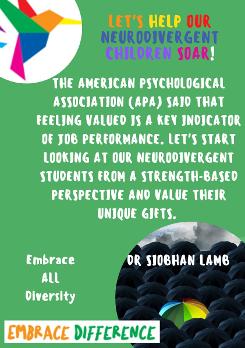 We deliver presentations to schools (teachers and carers) to help them relate and support their Neurodivergent young people through both our professional and lived experience. We also support families by advocating for their children within the school setting and coaching them to become more confidant advocators themselves. Neurodivergent students, who are struggling, are supported by a series of assessments and conversations that allow us to develop a strength-based, talent development profile that can be given to schools so that they may understand which environments will help the student thrive. We are passionate about empowering Neurodivergents and their allies with the knowledge and mindset necessary to Embrace Difference!